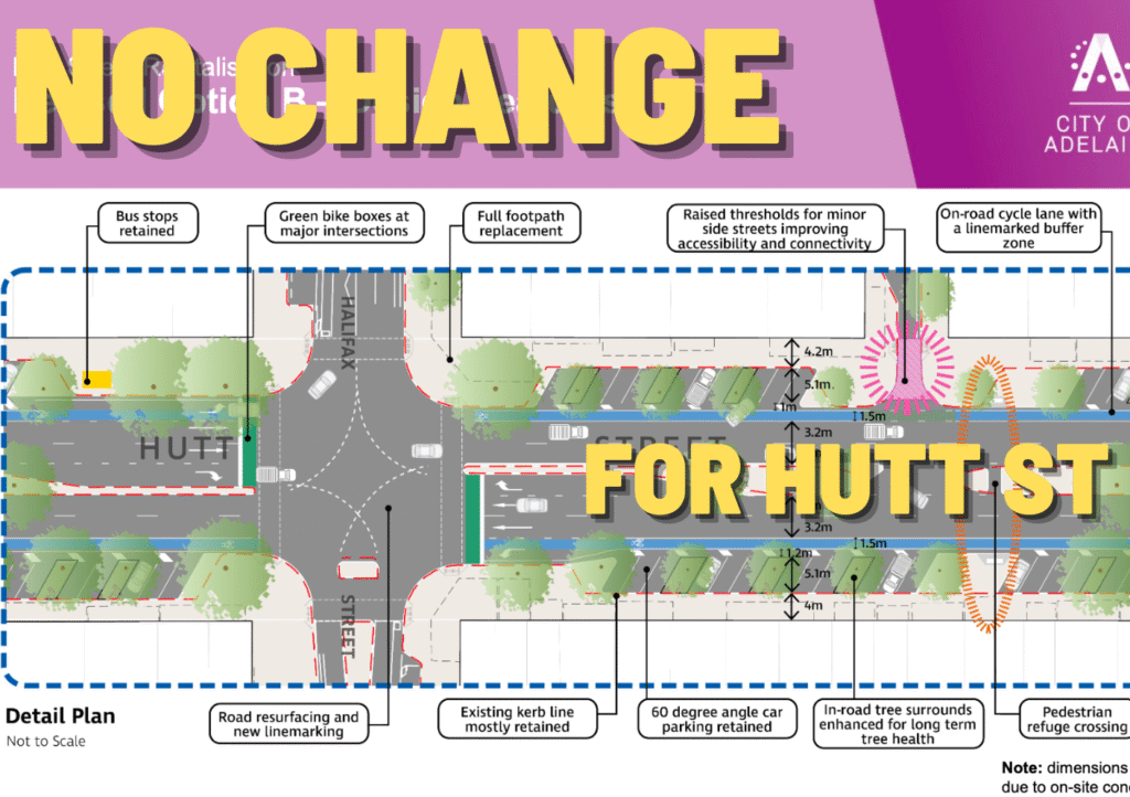 It’s therefore such a shame to learn that the City of Adelaide has rejected the community’s preferred design for the revitalisation of Hutt St in favour of a design that essentially maintains the status quo. This means that the proposal for a continuous run of footpaths as wide as the widest parts of footpath today, more greenery, more outdoor dining, more public seating AS WELL AS continuous, raised, wide separated bike lanes has been thrown out the window.