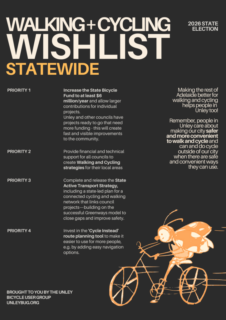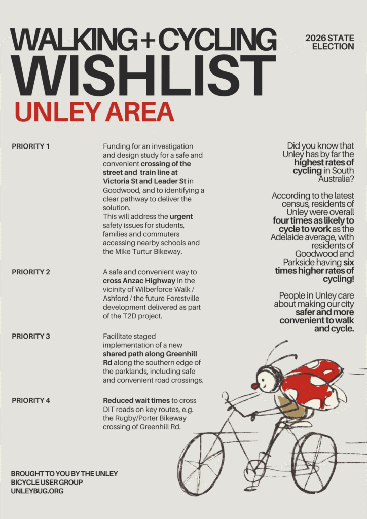 With a state election looming in the new year, Unley BUG has put together a wishlist of walking and cycling improvements we’d like to see in our area and across the state more generally.