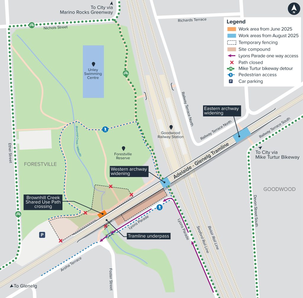 The works include the widening of the two archways under the tram line on either side of Goodwood Railway Station, along with the widening of the bridge over Brownhill Creek in Forestville Reserve. The works have been scheduled to happen while the tram line is out of action in the second half of this year, with estimated completion in March 2026.