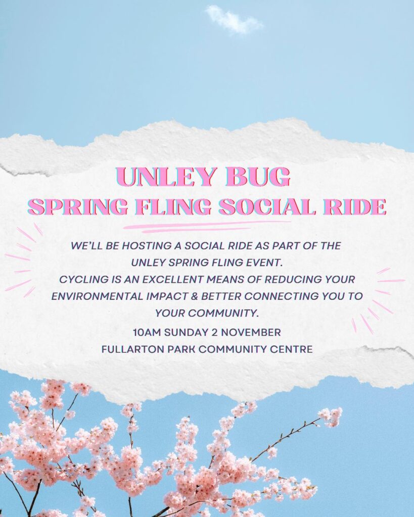 Unley BUG is teaming up with the council to host a social ride as part of next weekend’s Spring Fling event! We’ll be showing off some of Unley’s best and safest cycling paths on a short (10km) loop, departing from the Fullarton Community Centre at 10am, Sunday 2nd November. See you there!