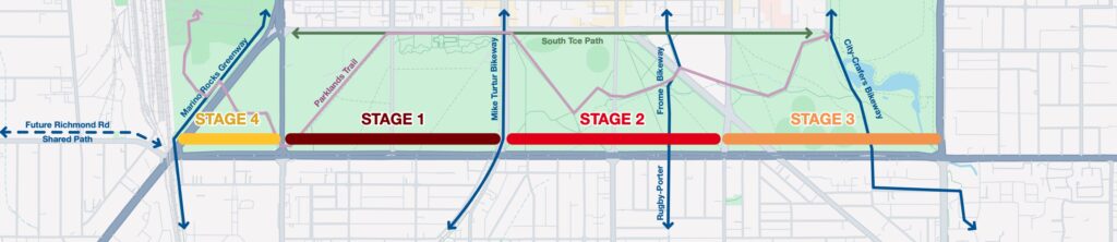 Below is an image of our proposal for the path, along with a suggestion for how it could be constructed in stages. Stage 1 would serve some of the least-accessible sections of parklands between Goodwood Rd and Peacock Rd, in the process connecting the Parklands Trail and the Mike Turtur Bikeway. Stage 2 would extend this eastwards to link the Mike Turtur Bikeway to the Hutt Rd, in the process connecting to the well-used crossing at Porter St. In Stage 3, access would be given to the popular sports grounds between Hutt Rd and Fullarton Rd, and finally Stage 4 would see the entire new route connected with the Marino Rocks Greenway and the future Richmond Rd shared use path in the west.