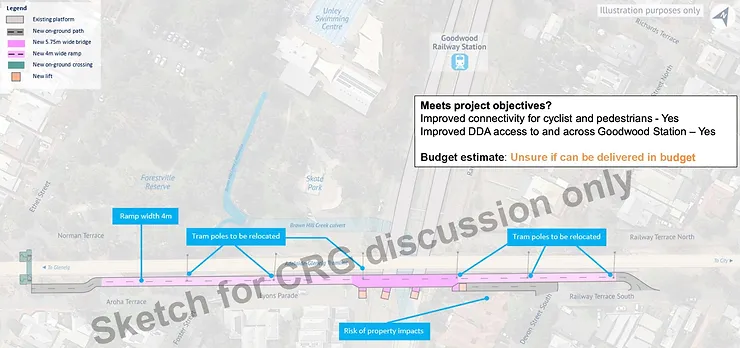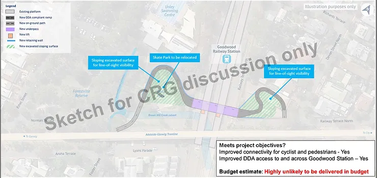 - Riding along the edge of the Forestville Reserve and above the Goodwood Train Station provides important passive safety surveillance to and from the overpass, the reserve and the station.